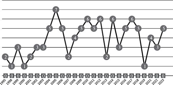 До 2003 г. число защит докторских диссертаций по финансовому праву не превышало 1–3 работ в год, научные школы только формировались в тот период. Однако уже с 2004 г. до настоящего времени (конца 2023 г.) наблюдается период, который характеризуется тем, что каждый год происходит защита, как правило, 5–6 докторских диссертационных исследований по финансовому праву. Иногда число таких защит достигает 7 работ в год, но встречаются и отдельные годы, когда число таких защит падает до 1–2 год. Но в целом наблюдается постоянство в числе защит докторских диссертационных исследований, что говорит о том, что наука финансового права России вышла на стабильную траекторию своего развития.