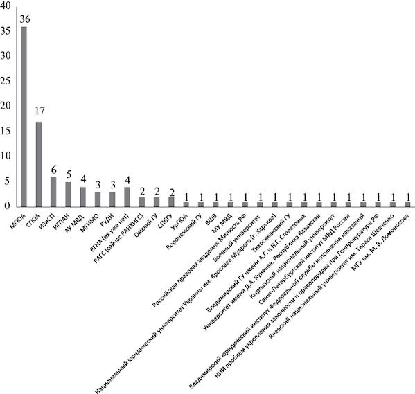2017 г. — 4 (Московский государственный юридический университет им. О. Е. Кутафина [МГЮА] — 3, Институт государства и права Российской академии наук — 1).
