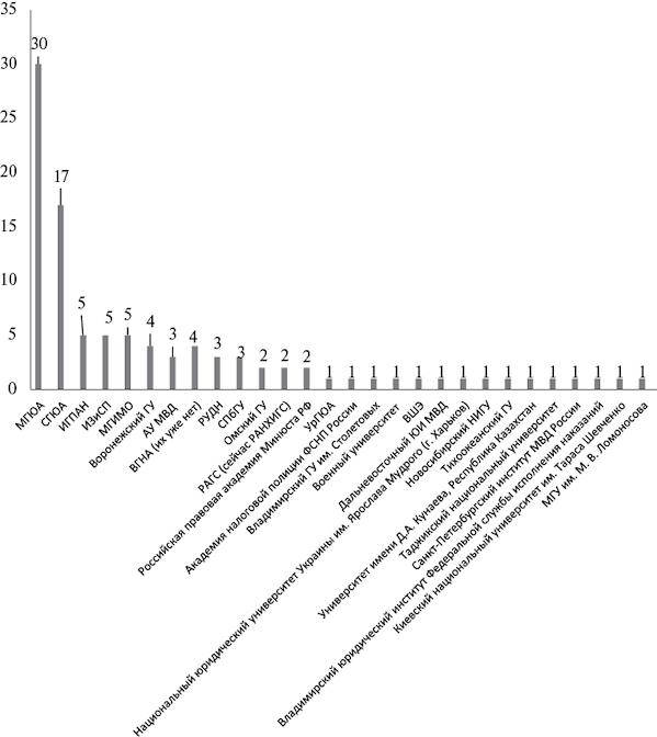 Рис. 4. Число докторских диссертационных исследований по финансовому праву по вузам их подготовки