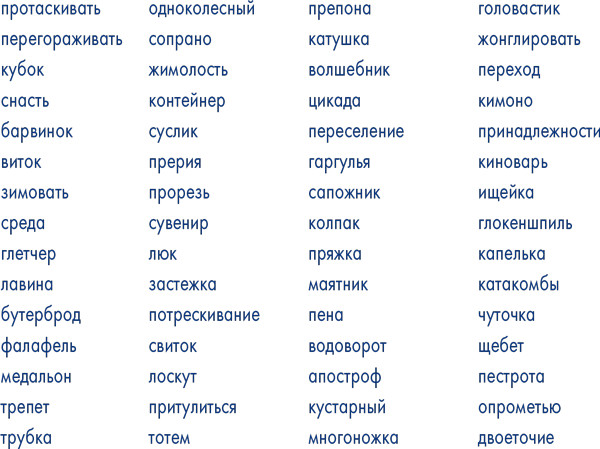 Воображение писателя жаждет слов. Чтобы питать свою творческую энергию, вам нужно что-то подбрасывать своему воображению 24 раза в день (и ночь) или чаще. Вот список некоторых моих любимых слов, которыми можно перекусить. Угощайтесь. Кормитесь. Пользуйтесь. Открывайте эту страницу всякий раз, когда ваше воображение начнет рычать и ему надо будет чего-нибудь погрызть. Какие слова из 1, 2, 3, 4, 5, 6 слогов пришлись вам по вкусу сегодня?
