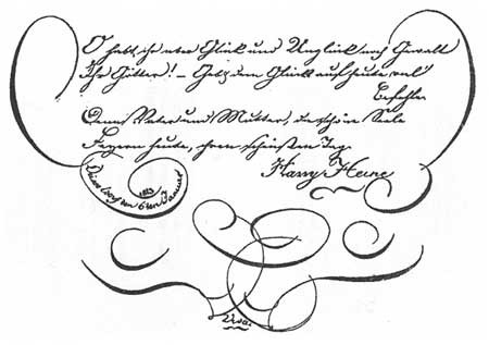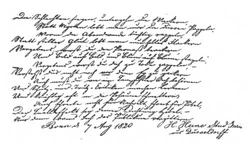 Гейне относился к этим занятиям самым серьезным образом, точно так же, как все серьезнее становилось его отношение к собственному поэтическому творчеству; отныне неизменным правилом его среди присущих всякому истинному дарованию мучительных сомнений в глубине своего творчества сделалось «Будь строг к самому себе»; и применение этого правила на деле, в продолжение всей жизни поэта, мы можем видеть в многочисленных оставшихся после него автографах стихотворений, где чуть не каждая строчка перемарана и переделана по несколько раз; в этом случае он тоже многим обязан Шлегелю, который перечитывал с ним его стихи и, указывая на те или другие несовершенства формы, побуждал молодого поэта работать над этим до тех пор, пока все недостатки не оказывались устраненными.