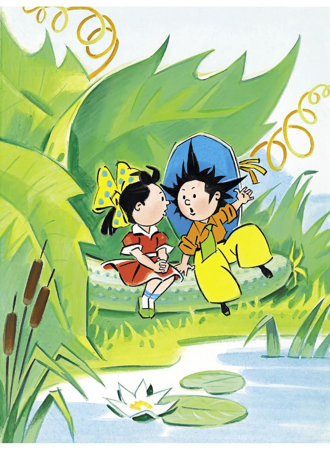 Однажды Незнайка встретился с Кнопочкой на берегу реки. Они уселись на большом зелёном огурце, которые во множестве росли вокруг. Солнышко уже поднялось высоко и как следует пригревало землю, но Незнайке и Кнопочке не было жарко, потому что огурец, на котором они сидели, словно на лавочке, был довольно прохладный, а сверху их защищали от солнца широкие огуречные листья, раскинувшиеся над ними, как огромные зелёные зонтики. Ветерок тихо шуршал в траве и поднимал на реке лёгкую рябь, которая так и сверкала на солнышке. Тысячи солнечных зайчиков, отразившись от поверхности воды, плясали на огуречных листьях, освещая их снизу каким-то таинственным светом. От этого казалось, что воздух под листьями, где сидели Незнайка и Кнопочка, тоже волнуется и трепещет, словно машет бесчисленными невидимыми крылышками, и всё это выглядело каким-то необычным, волшебным. Но Незнайка и Кнопочка не замечали никакого волшебства вокруг, так как вся эта картина была для них слишком привычна, да к тому же каждый из них был занят своими мыслями. Кнопочке очень хотелось поговорить о сказках, но Незнайка почему-то упорно молчал, и лицо у него было такое кислое и сердитое, что она даже боялась заговорить с ним.