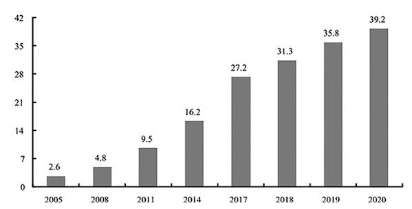 В последние годы цифровая экономика стремительно развивалась и стала главной движущей силой глобального экономического роста. В Белой книге по глобальной цифровой экономике: новый этап восстановления под воздействием COVID-19, опубликованной Китайской академией информационных и коммуникационных технологий55, отмечается, что масштабы цифровой экономики в крупнейших странах мира достигли 332,6 трлн долларов США в 2020 г., что означает номинальный рост на 3,0% (0,9 трлн долларов США) по сравнению с предыдущим годом, а доля цифровой экономики в валовом внутреннем продукте (ВВП) различных стран достигла 43,7%, а в развитых странах ее доля достигла 54,3%. В Китае масштабы цифровой экономики к 2020 г. достигнут 39,2 трлн юаней (5,4 трлн долларов США), заняв второе место в мире, а ее доля в ВВП достигнет 38,6% (диаграммы 1, 256).