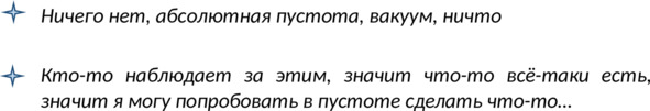 Конечно, продолжая логическую последовательность, рождается простой вопрос: откуда взялось сознание, которое допустило мысль, из чего оно состоит? Чтобы почувствовать и понять такую глубину сотворения мира, пожалуйста, закройте глаза и постарайтесь представить абсолютную пустоту, ничто, вакуум. Делать это желательно в тихом и уединённом месте, чтобы ваши мысли могли свободно течь и были управляемы вами. Пребывайте в этой «пустоте» как можно дольше и постарайтесь улавливать каждую адекватную мысль, чувство или ощущение, касающиеся нашего эксперимента. В итоге вот срез мыслей, которые приходят в этом погружении:
