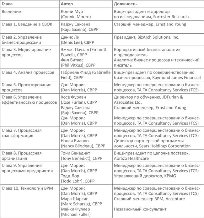 Все авторы принимали участие в работе на добровольной основе. В число авторов подбирались люди с глубокими познаниями, необходимыми для написания каждой из десяти глав. После того как команда сформировалась, она обсудила содержание каждой из глав. Во время написания глав авторы встречались еженедельно, чтобы обсудить концепции, подходы и методы и убедиться, что в CBOK® все согласовано. Это дало возможность проверить идеи, убедиться в полноте материала и выработать согласованный взгляд внутри ABPMP.