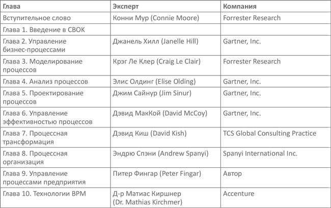 Комитету CBOK® удалось привлечь к написанию вступительных слов известных экспертов в области BPM. Они поделились своим видением того, как в будущем могут развиваться те или иные аспекты BPM, и тем самым повысили ценность соответствующих глав.