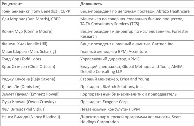 Чтобы быть уверенными в отсутствии белых пятен и разрешить возможные споры, из экспертов был сформирован комитет рецензентов. Все его члены — сертифицированные BPM-профессионалы. Они рассмотрели каждую главу и обсудили на комитете все проблемы. По результатам были внесены изменения, сделавшие изложение более полным и сбалансированным.