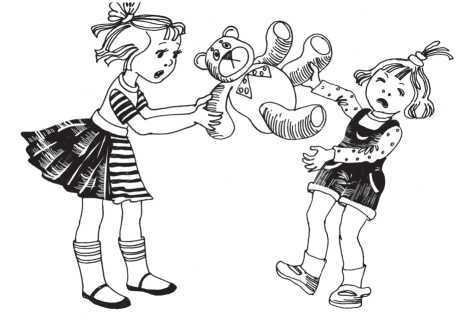 – Я знаю, ты не хочешь отдавать ей игрушку, это твоя игрушка, и несправедливо у тебя ее отбирать. Наверное, она тоже думает, что несправедливо, что ей не дают. Поэтому давай что-нибудь придумаем. Например, можно сделать так. Игрушечка где-то полежит отдельно – ей больно, когда ее тянут в разные стороны. Потом отвлечем маленькую, и ты поиграешь. А потом дашь поиграть ей.