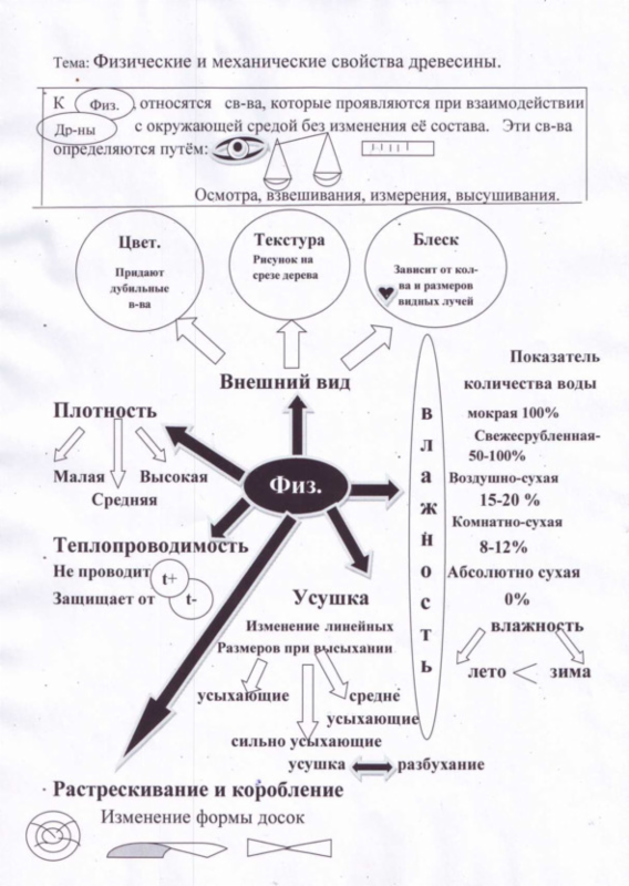 Конспект разделён на две страницы. Первая страница посвящена физическим свойствам древесины, вторая механическим. В начале первой страницы дано общее определение физических свойств. При этом, наиболее распространённые слова написаны в сокращении: «Физ» — физические, «св-ва» — свойства, «Мех» — механические. Над словами: «осмотра», «взвешивания», «измерения» стоят схематические символы обозначающие данное действие, это глаз, весы и линейка. В целом, Определение будет звучать так: «К физическим относятся такие свойства, которые появляются при взаимодействии древесины с окружающей средой без изменений ее состава. Эти свойства определяют по внешнему виду древесины путем осмотра, взвешивания, измерения, высушивания.»