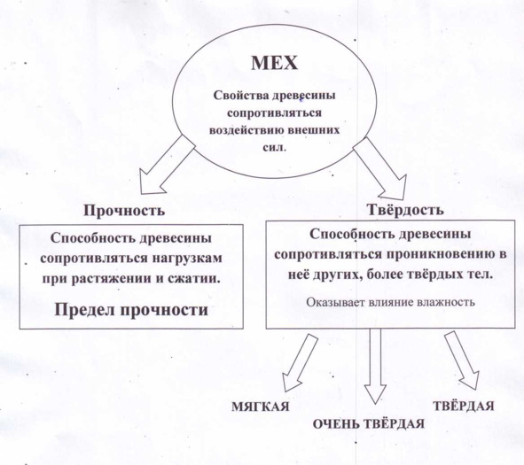 Вторая страница посвящена механическим свойствам древесины. Здесь дано определение механических свойств. Слово «механические» дано в сокращении и обозначено «мех». От общего определения идут стрелки к словам: «прочность» и «твёрдость», которые представляют собой основные виды механических свойств древесины (при необходимости, можно добавить упругость).
