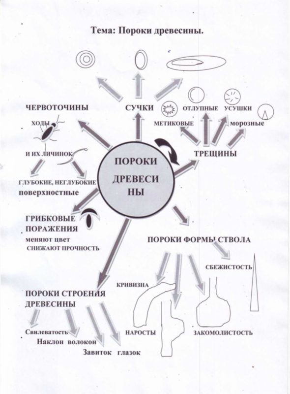 Пороки строения древесины обозначены без рисунков и символов лишь одними названиями. Это связано с тем, что при их изучении использовались образцы из коллекции, но при необходимости конспект можно дополнить схематическими рисунками пороков строения древесины.