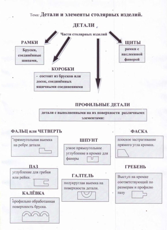 Детали — составные части столярных изделий, к ним относятся: бруски, рамки, щиты, коробки и профильные детали.