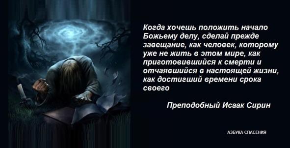 Когда хочешь положить начало Божьему делу, сделай прежде завещание, как человек, которому уже не жить в этом мире, как приготовившийся к смерти и отчаявшийся в настоящей жизни, как достигший времени срока своего. Преподобный Исаак Сирин