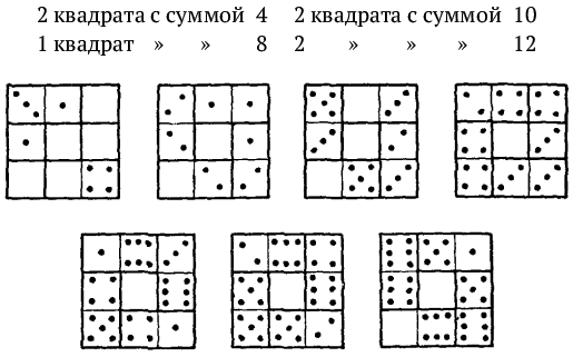 17. Сумма очков всех сторон искомого квадрата должна равняться 44 × 4 = 176, т. е. на 8 больше, чем сумма очков на косточках полного набора домино (168). Происходит это, конечно, оттого, что числа очков, занимающих вершины квадрата, считаются дважды. Сказанным определяется, какова должна быть сумма очков на вершинах квадрата: 8. Это несколько облегчает поиски требуемого расположения, хотя нахождение его все же довольно хлопотливо. Решение показано на рис. 16.