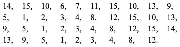 Точно так же возможно, не трогая шашки 1, привести шашку 2 на соседнее место вправо. Затем, не трогая шашек 1 и 2, можно поместить шашки 3 и 4 на их нормальные места: если они случайно не находятся в двух последних вертикальных рядах, то легко привести их в эту область и затем рядом передвижений достичь желаемого результата. Теперь верхняя строка 1, 2, 3, 4 приведена в порядок, и при дальнейших манипуляциях с шашками мы трогать этого ряда не будем. Таким же путем стараемся мы привести в порядок и вторую строку: 5, 6, 7, 8; легко убедиться, что это всегда достижимо. Далее, на пространстве двух последних рядов необходимо привести в нормальное положение шашки 9 и 13; это тоже всегда возможно. Из всех приведенных в порядок шашек 1, 2, 3, 4, 5, 6, 7, 8, 9 и 13 в дальнейшем ни одной не перемещают; остается небольшой участок в шесть полей, в котором одно свободно, а пять остальных заняты шашками 10, 11, 12, 14, 15 в произвольном порядке. В пределах этого шестиместного участка всегда можно привести на нормальные места шашки 10, 11, 12. Когда это достигнуто, то в последнем ряду шашки 14 и 15 окажутся размещенными либо в нормальном порядке, либо в обратном (рис. 12). Таким путем, который читатели легко могут проверить на деле, мы приходим к следующему результату.