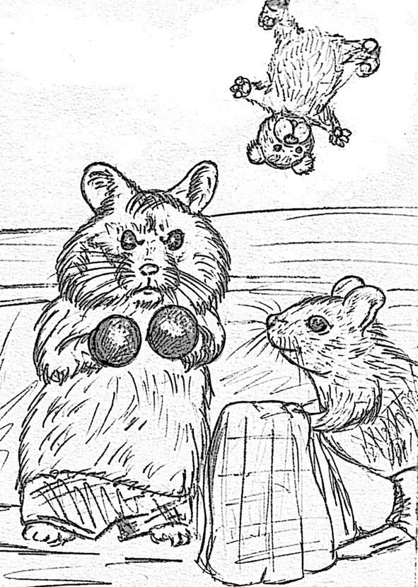 Хоря, несмотря на свой рост, выглядел грозно. На его лапки были надеты чёрные круглые пробки. От одеколона, кажется. Хомяк с остервенением лупил большого плюшевого медведя, подвешенного за правую заднюю лапу к лампочке. Огромные щёки яростно трепетали, глазки блистали молниями.
