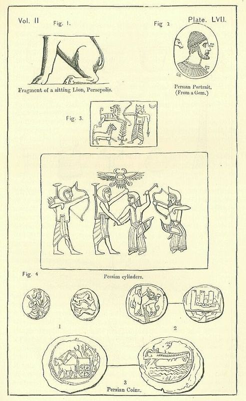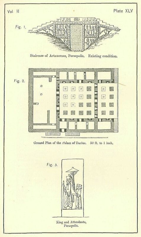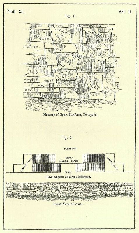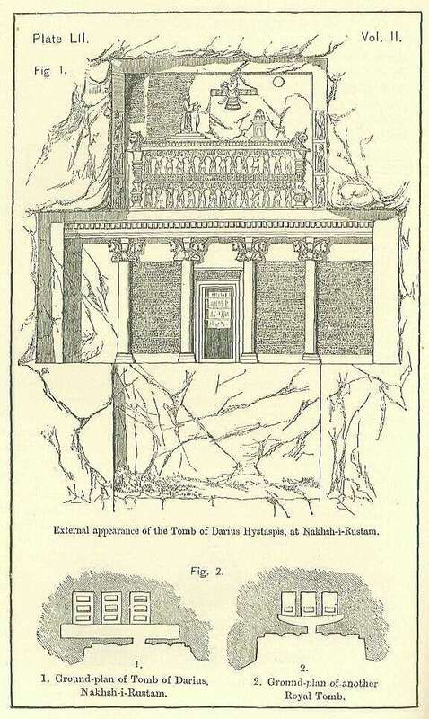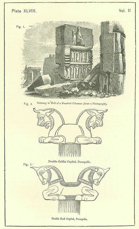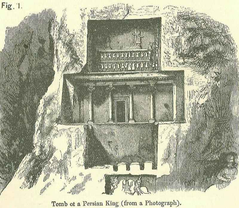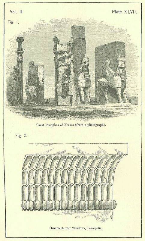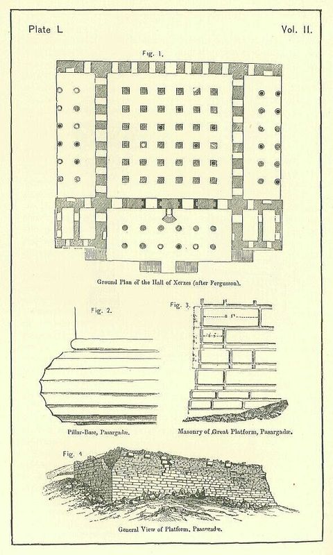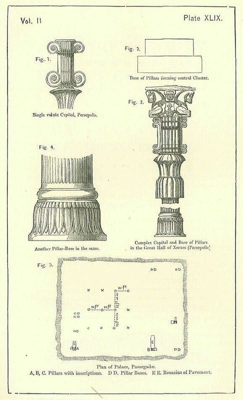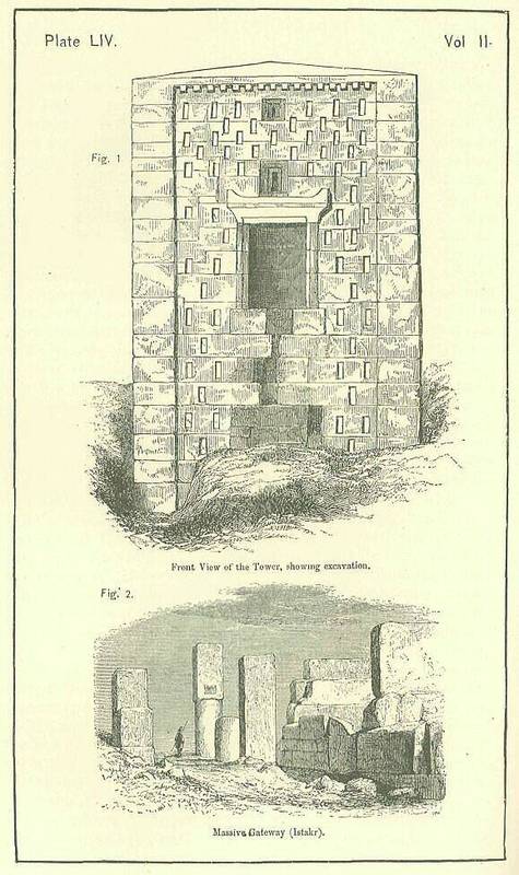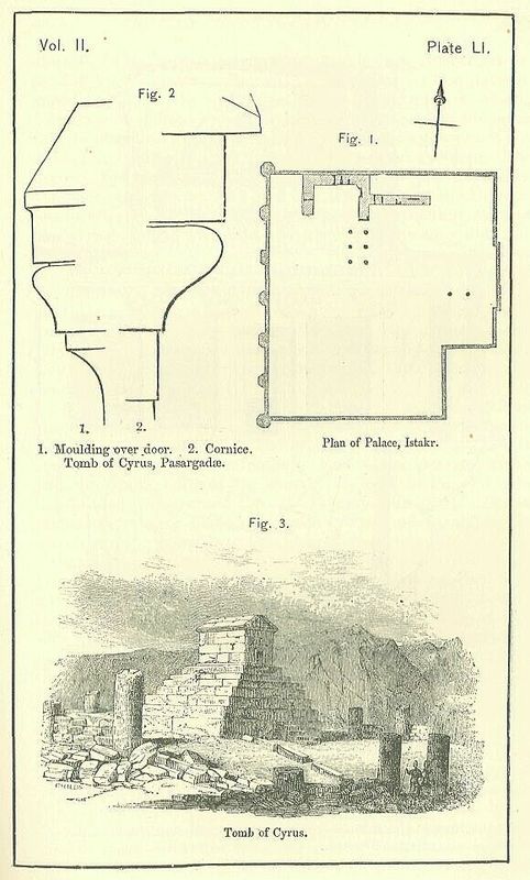 It is in these regions, which combine facility of defence with pleasantness of climate, that the principal cities of the district have at all times been placed. The earliest known capital of the region was Pasargadae, or Persagadae, as the name is sometimes written, of which the ruins still exist near Murgab, in lat. 30° 15' long. 53° 17'. Here is the famous tomb of Cyrus, whereof a description will be given hereafter; and here are also other interesting remains of the old Persian architecture. Neither the shape nor the extent of the town can be traced. The situation was a plain amid mountains, watered by small streams which found their way to a river of some size (the Pulwar) flowing at a little distance to the west. [PLATE XXVII Fig. 1.]