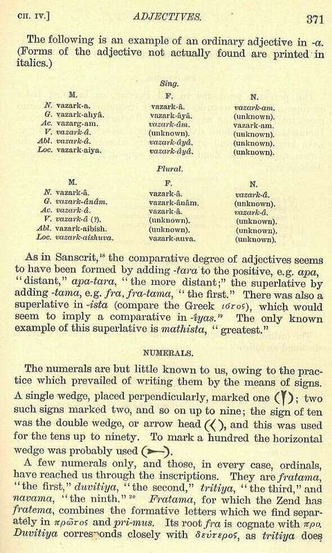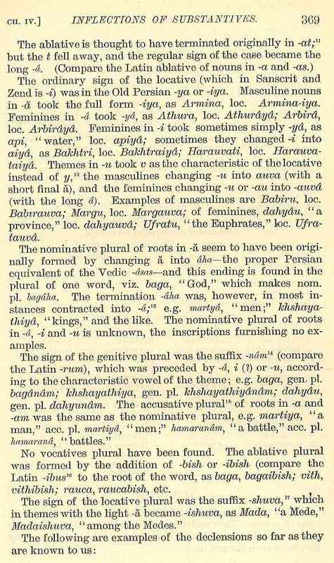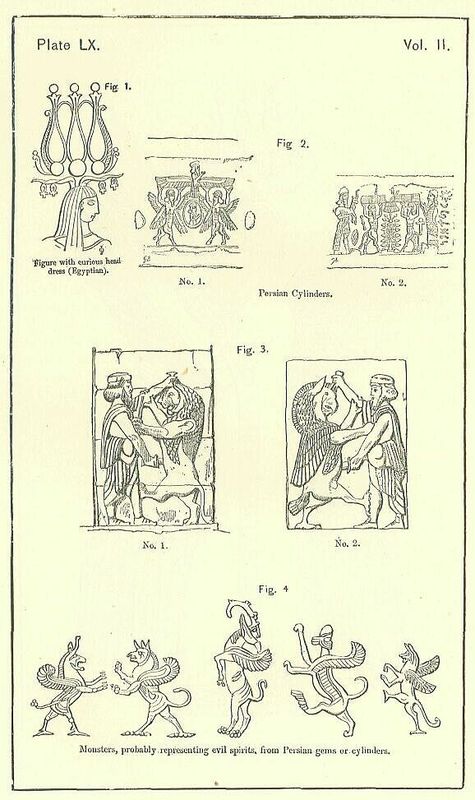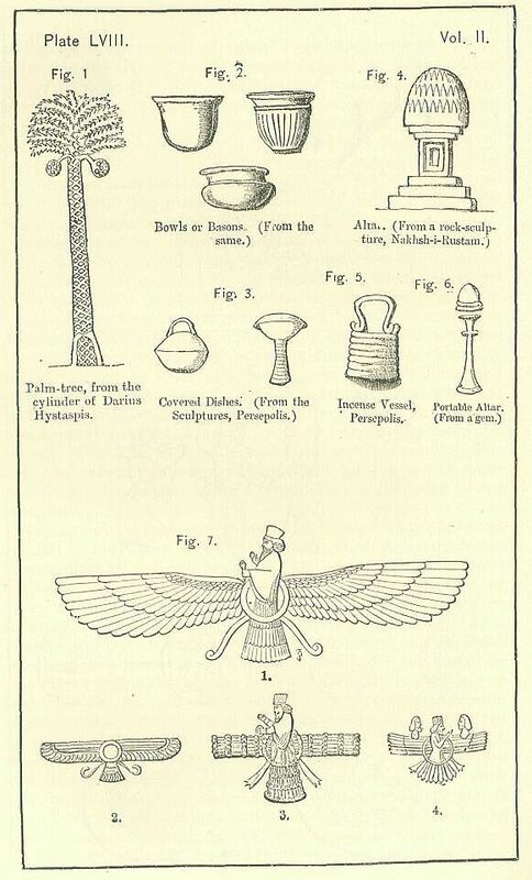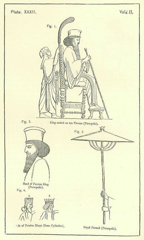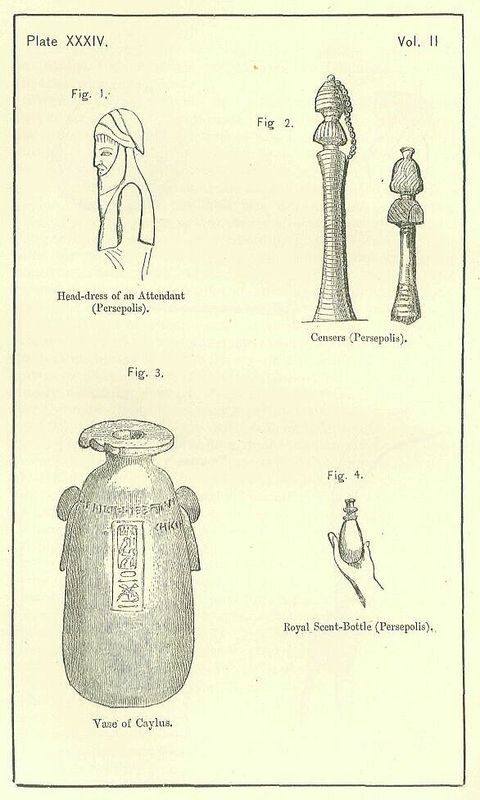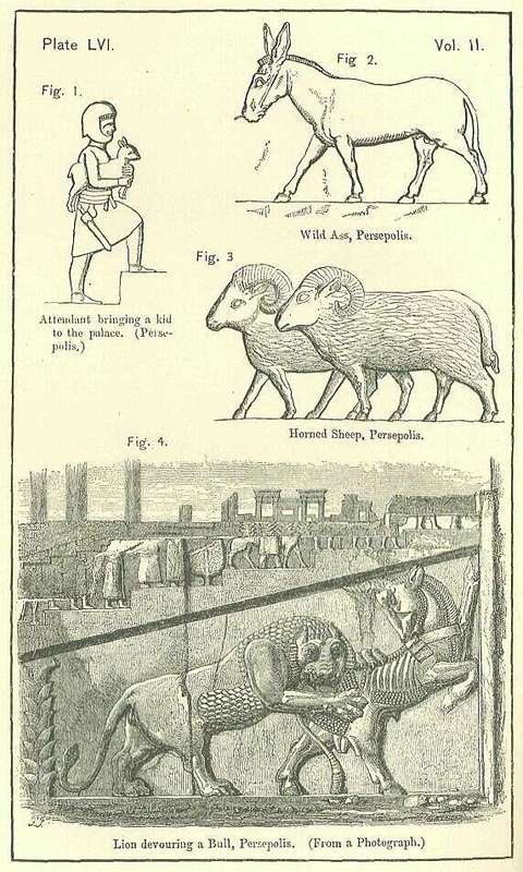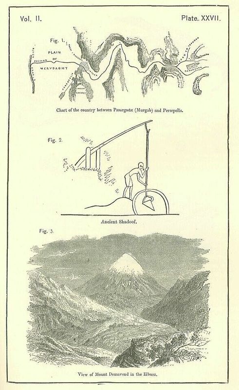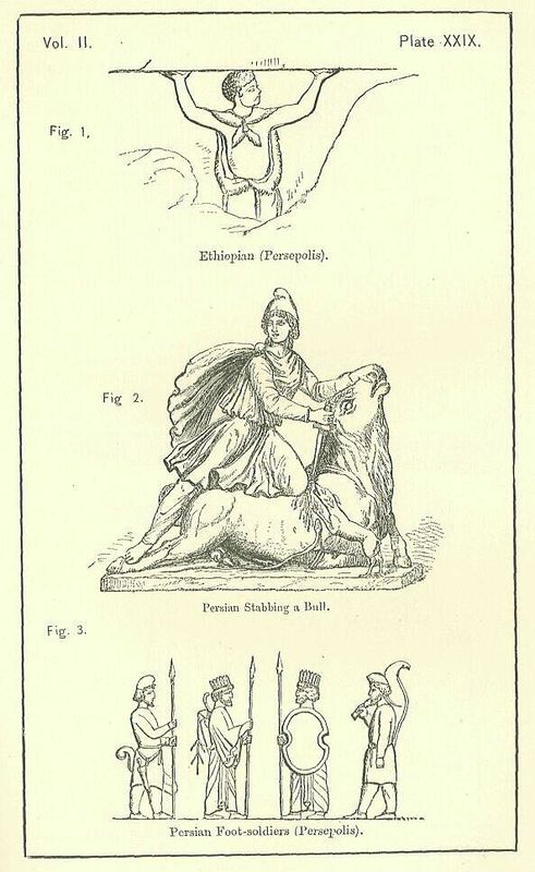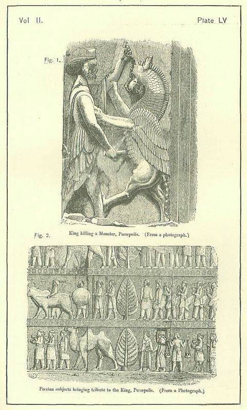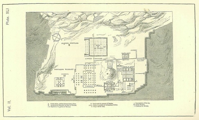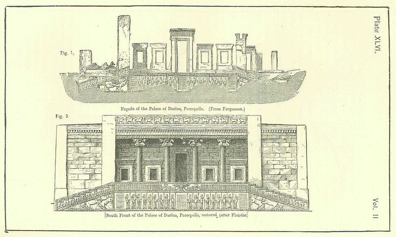 It is in these regions, which combine facility of defence with pleasantness of climate, that the principal cities of the district have at all times been placed. The earliest known capital of the region was Pasargadae, or Persagadae, as the name is sometimes written, of which the ruins still exist near Murgab, in lat. 30° 15' long. 53° 17'. Here is the famous tomb of Cyrus, whereof a description will be given hereafter; and here are also other interesting remains of the old Persian architecture. Neither the shape nor the extent of the town can be traced. The situation was a plain amid mountains, watered by small streams which found their way to a river of some size (the Pulwar) flowing at a little distance to the west. [PLATE XXVII Fig. 1.]