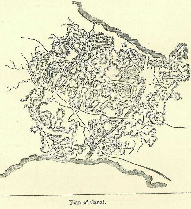 The canal of Athos was also quite a legitimate and judicious undertaking. [PLATE LXI.] No portion of the Greek coast is so dangerous as that about Athos. Greek boatmen even at the present day refuse to attempt the circumnavigation; and probably any government less apathetic than that of the Turks would at once re-open the old cutting. The work was one of very little difficulty, the breadth of the isthmus being less than a mile and a half, the material sand and marl, and the greatest height of the natural ground above the level of the sea about fifty feet. The construction of a canal in such a locality was certainly better than the formation of a ship-groove or Diolcus—the substitute for it proposed by Ferodotus, [PLATE LXI.] not to mention that it is doubtful whether at the time that this cutting was made ship-grooves were known even to the Greeks.