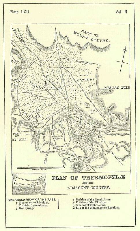 Thus far had the Greeks allowed the invader to penetrate their country without offering him any resistance. Originally there had been an intention of defending Thessaly, and an army under Evsenetus, a Spartan polemarch, and Themistocles, the great Athenian, had proceeded to Tempe, in order to cooperate with the Thessalians in guarding the pass. But the discovery that the Olympic range could be crossed in the,place where the army of Xerxes afterwards passed it had shown that the position was untenable; and it had been then resolved that the stand should be made at the next defensible position, Thermopylae. [PLATE LXII.] Here, accordingly, a force was found—small, indeed, if it be compared with the number of the assailants, but sufficient to defend such a position as that where it was posted against the world in arms. Three hundred Spartans, with their usual retinue of helots, 700 Lacedaemonians, other Peloponnesians to the number of 2800, 1000 Phocians, the same number of Locrians, 700 Thespians, and 400 Thebans, formed an army of 9000 men—quite as numerous a force as could be employed with any effect in the defile they were sent to guard. The defile was a long and narrow pass shut in between a high mountain, Callidromus, and the sea, and crossed at one point by a line of wall in which was a single gateway. Unless the command of the sea were gained, or another mode of crossing the mountains discovered, the pass could scarcely be forced.