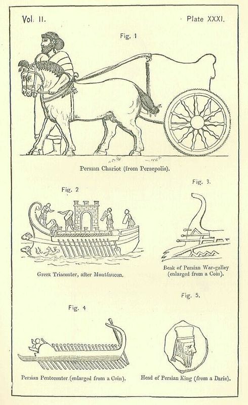 These movements were executed late in the day on which the Persian fleet arrived at Phalerum. During the night intelligence reached the commanders that the retreat of the Greeks was about to commence at once; whereupon the Persian right wing was pushed forward into the strait, and carried beyond the Greek position so as to fill the channel where it opens into the bay of Eleusis. The remainder of the night passed in preparations for the battle on both sides. At daybreak both fleets advanced from their respective shores, the Persians being rather the assailants. Their thousand vessels were drawn up in three lines, and charged their antagonists with such spirit that the general inclination on the part of the Greeks was at first to retreat. Some of their ships had almost touched the shore, when the bold example of one of the captains, or a cry of reproach from unknown lips, produced a revulsion of feeling, and the whole line advanced in good order. The battle was for a short time doubtful; but soon the superiority of Greek naval tactics began to tell. The Persian vessels became entangled one with another, and crashing together broke each other's oars. The triple line increased their difficulties. If a vessel, overmatched, sought to retreat, it necessarily came into collision with the ships stationed in its rear. These moreover pressed too eagerly forward, since their captains were anxious to distinguish themselves in order to merit the approval of Xerxes. The Greeks found themselves able to practice with good effect their favorite manoeuvre of the periplus, and thus increased the confusion. It was not long before the greater part of the Persian fleet became a mere helpless mass of shattered or damaged vessels. Five hundred are said to have been sunk—the majority by the enemy, but some even by their own friends. The sea was covered with wrecks, and with wretches who clung to them, till the ruthless enemy slew them or forced them to let go their hold.