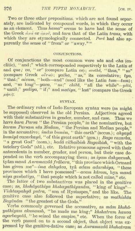 The geographical extent of the Fifth Monarchy was far greater than that of any one of the four which had preceded it. While Persia Proper is a comparatively narrow and poor tract, extending in its greatest length only some seven or eight degrees (less than 500 miles), the dominions of the Persian kings covered a space fifty-six degrees long, and in places more than twenty degrees wide. The boundaries of their empire were the desert of Thibet, the Sutlej, and the Indus, on the east; the Indian Sea, the Persian Gulf, the Arabian and Nubian deserts, on the south; on the west, the Greater Syrtis, the Mediterranean, the Egean, and the Strymon river; on the north, the Danube, the Black Sea, the Caucasus, the Caspian, and the Jaxartes. Within these limits lay a territory, the extent of which from east to west was little less than 3000 miles, while its width varied between 500 and 1500 miles. Its entire area was probably not less than, two millions of square miles—or more than half that of modern Europe. It was thus at least eight times as large as the Babylonian Empire at its greatest extent, and was probably more than four times as large as the Assyrian.