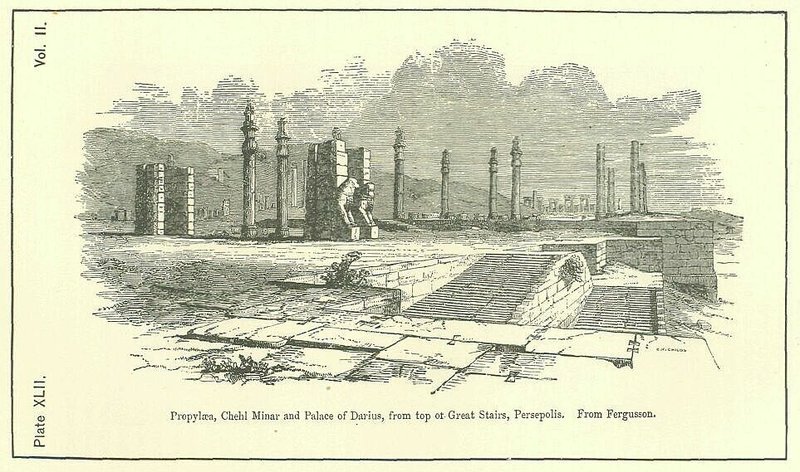 At the distance of thirty miles from Pasargadae, or of more than forty by the ordinary road, grew up the second capital, Persepolis, occupying a more southern position than the primitive seat of power, but still situated towards the edge of the plateau, having the mountain-barrier to the south-west and the desert at no great distance to the north-east. Like its predecessor, Persepolis was situated in a plain, but in a plain of much larger dimensions and of far greater fertility. The plain of Merdasht is one of the most productive in Persia, being watered by the two streams of the Bendamir and the Pulwar, which unite a few miles below the site of the ancient city. From these two copious and unfailing rivers a plentiful supply of the precious fluid can at all times be obtained; and in Persia such a supply will always create the loveliest verdure, the most abundant crops, and the richest and thickest foliage. The site of Persopolis is naturally far superior to that in which the modern provincial capital, Shiraz, has grown up, at about the same distance from Persepolis as that is from Pasargadae. and in the same—i.e. in a south-west—direction.