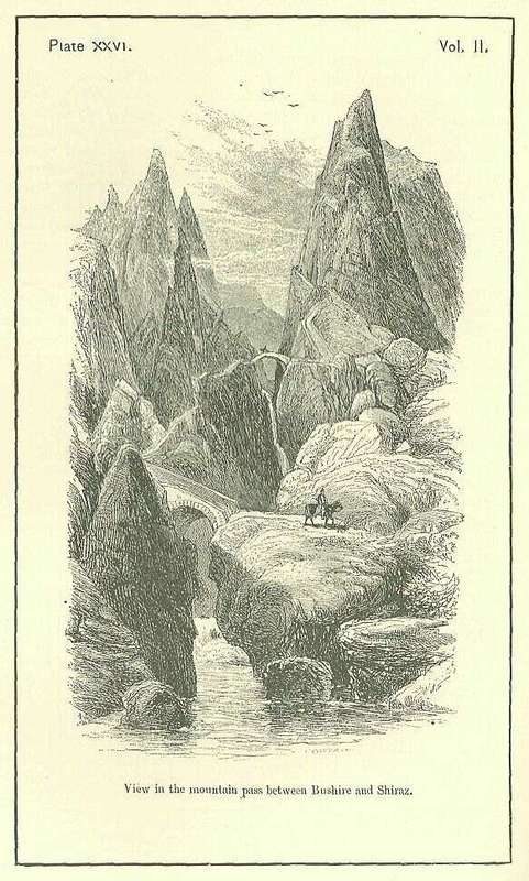 The most remarkable feature of the country consists in the extraordinary gorges which pierce the great mountain-chain, and render possible the establishment of routes across that tremendous barrier. Scarped rocks rise almost perpendicularly on either side of the mountain-streams, which descend rapidly with frequent cascades and falls. Along the slight irregularities of these rocks the roads are carried in zigzags, often crossing the streams from side to side by bridges of a single arch, which are thrown over profound chasms where the waters chafe and roar many hundred feet below. [PLATE XXVI.] The roads have for the most part been artificially cut in the sides of the precipices, which rise from the streams sometimes to the height of 2000 feet. In order to cross from the Persian Gulf to the high plateau of Iran, no fewer than three or four of these kotuls, or strange gorge-passes, have to be traversed successively. Thus the country towards the edge of the plateau is peculiarly safe from attack, being defended on the north and east by vast deserts, and on the south by a mountain-barrier of unusual strength and difficulty.