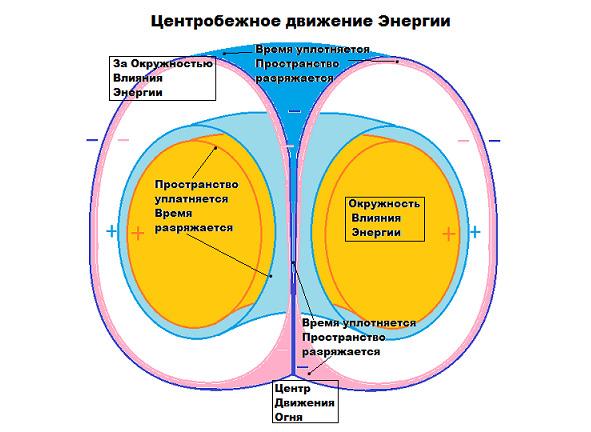 If the centripetal movement of the incoming energy directs the Fire to one place, namely to the Channel of the Movement of Fire, which achieves the discharge of the density of Time and the compaction of Matter (Space) by this Fire, then the centrifugal movement of the incoming energy directs the Fire into radial radiation from the Center of its movement, which achieves the injection of density Time and rarefaction of Matter (Space).