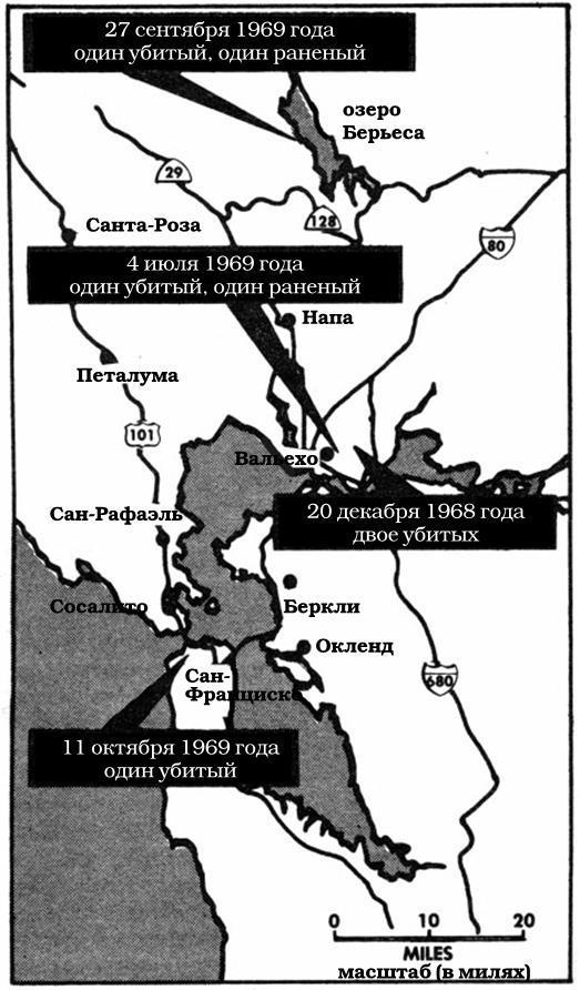 В качестве политического карикатуриста «Сан-Франциско кроникл», крупнейшей газеты Северной Калифорнии, я имел доступ ко всем материалам, поступавшим в редакцию, – к каждому письму, к каждой шифровке, к каждому клочку окровавленной одежды очередной жертвы. Поначалу я испытывал настоящие потрясения – поражали чисто внешние характеристики этих посланий, но со временем во мне созрела решимость распутать загадочный клубок, найти ниточку к личности убийцы, выйти на него. Когда выяснилось, что эта задача мне не по силам, я решил хотя бы собрать и обобщить всю доступную информацию, чтобы облегчить работу по обезвреживанию преступника.