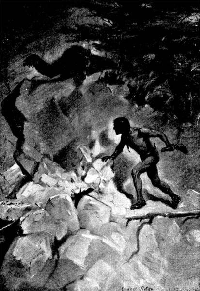 Then he smelled some strange animal smell and heard heavy footsteps; and not knowing what else to do, he climbed a tree. Presently a band of great, long-necked, slim-legged animals, taller than his Mother, came by under the tree. He had seen such once before and had not been afraid of them then, because he had been with his Mother. But now he kept very quiet in the tree, and the big creatures stopped picking the grass when they were near him, and blowing their noses, ran out of sight.