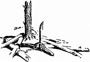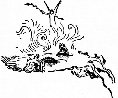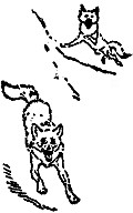 Bang! bang! and Mooney and Frizzle sank in dying agonies beside her, and Wahb, terrified and stupefied, ran in a circle about them. Then, hardly knowing why, he turned and dashed into the timber-tangle, and disappeared as a last bang left him with a stinging pain and a useless, broken hind paw.