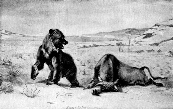 Up jumped the gentle Mother, changed into a perfect demon, and over the bank in time to see a huge Range-bull make a deadly charge at what he doubtless took for a yellow dog. In a moment all would have been over with Frizzle, for he had missed his footing on the bank; but there was a thumping of heavy feet, a roar that startled even the great Bull, and, like a huge bounding ball of yellow fur, Mother Grizzly was upon him. Him! the monarch of the herd, the master of all these plains, what had he to fear? He bellowed his deep war-cry, and charged to pin the old one to the bank; but as he bent to tear her with his shining horns, she dealt him a stunning blow, and before he could recover she was on his shoulders, raking the flesh from his ribs with sweep after sweep of her terrific claws.