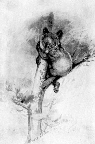 After an hour or two they began to yawn and stretch themselves, except little Fuzz, the smallest; she poked out her sharp nose for a moment, then snuggled back between her Mother's great arms, for she was a gentle, petted little thing. The largest, the one afterward known as Wahb, sprawled over on his back and began to worry a root that stuck up, grumbling to himself as he chewed it, or slapped it with his paw for not staying where he wanted it. Presently Mooney, the mischief, began tugging at Frizzle's ears, and got his own well boxed. They clenched for a tussle; then, locked in a tight, little grizzly yellow ball, they sprawled over and over on the grass, and, before they knew it, down a bank, and away out of sight toward the river.