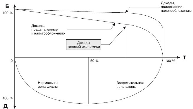 Рис. 1.1.Кривая Лаффера: Д – доходы; Б – налоговая база; заинтересованность в легальном заработке; Т – ставка налога, %