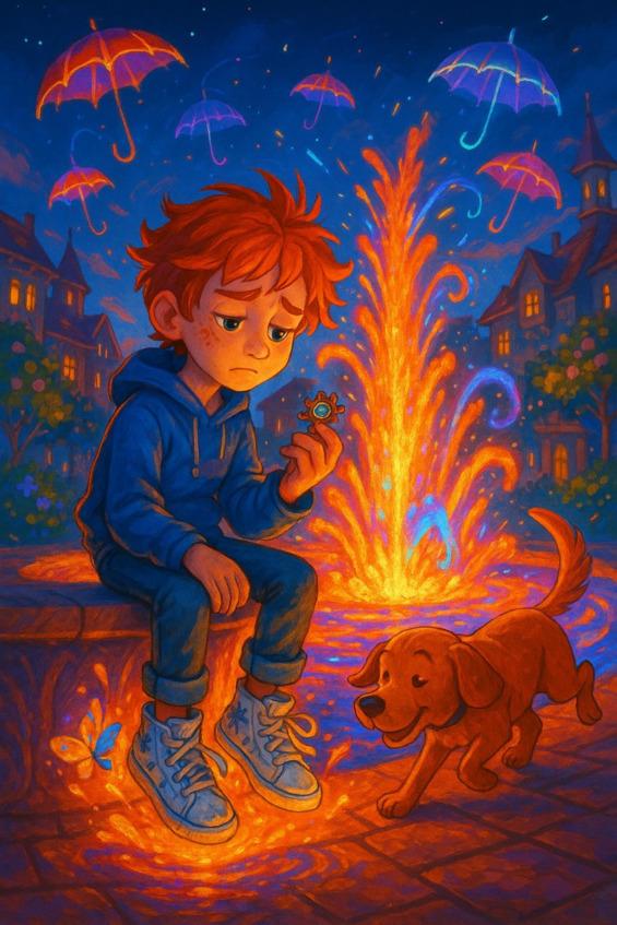 На краю этого волшебного кипения, свесив ноги так, что кончики его вручную разукрашенных маркерами «на удачу» кроссовок почти касались светящейся воды, сидел Джо-Джо Весельчак. Его огненно-рыжие волосы казались темнее в сумерках, а веснушки, словно рассыпанные чьей-то щедрой рукой золотые пылинки, почти сливались с кожей. В пальцах он вертел осколок циферблата — теплый, с чуть зазубренным краем. Последняя память о Тихоне. Будильник-друг, жертвуя собой, разлетелся на части, спасая своих друзей и саму Веселундию, теперь напоминал о себе лишь тихим звоном крошечной шестерёнки, которую Джо-Джо носил в кармане жилета, рядом с камнем в виде Чихающего Кота.