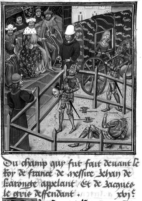 Суд над Жаком Ле Гри по обвинению в покушении на честь жены его соседа Жана де Карружа, Франция, 1386 г.