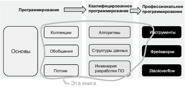 Схема на с. 12 связывает содержимое книги с широким спектром знаний, необходимых профессиональному разработчику. Изучение Java требует знакомства с классами, методами, полями и т.д. (здесь база не рассматривается). Далее освоение языка идет по трем путям: