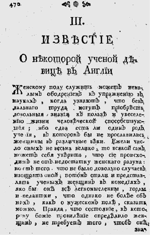К сожалению, В. О. Михневич, кратко перечислив нескольких писательниц, переводчиц и поэтесс, деятельность которых с тех пор многократно изучалась, назвав несколько известных светских дам — покровительниц наук и художеств, также неоднократно привлекавших внимание исследователей, не назвал ни одного имени женщины-ученой, кроме, конечно, Е. Р. Дашковой. Таким образом, не очень понятно, на чем же основывалось его утверждение о большом количестве женщин-ученых в России второй половины XVIII века и на основании чего он давал такую детальную характеристику их социального положения, уровня образования и, главное, характера занятий науками. Возможно ли, что В. О. Михневич ошибался или дал волю писательской фантазии? Посмотрим на этот предмет несколько подробнее.