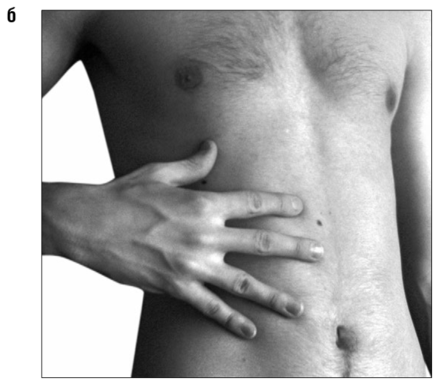 Растирание производится плотно, с постоянным давлением, но без болезненных ощущений. Поскольку растирание производится в обе стороны, о векторе направления мы не говорим. Движение может быть гребнеобразное или граблеобразное. Гребень создают средние фаланги пальцев (фото 2, а), растирание получается мягким. Граблеобразное растирание более жесткое, его производят подушечками первых фаланг пальцев, несколько разводя их в стороны (фото 2, б). Щипцеобразное движение тоже считается растиранием, при этом массируемую область захватывают между большим и всеми остальными пальцами руки.