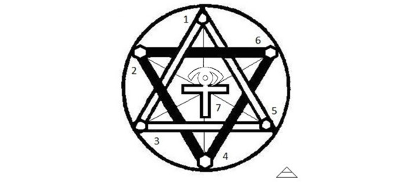 О семи принципах писал и Гермес Трисмегист (принципы Ментальности, Соответствия, Вибрации, Полярности, Ритма, Причинности, Пола). В этой работе была предпринята попытка систематизировать эти законы по принципу необходимости, достаточности и независимости. Законы Мироздания, а именно: 1. Закон Уникальности, 2. Закон Дуальности, 3. Закон Вибрации, 4. Закон Резонанса, 5. Закон Спирали, 6. Закон Причинности, 7. Закон Единства — на приведенной ниже на рис. 1 двумерной проекции ее трехмерной модели обозначены проекциями узлов пирамид (слово «пирамида» составлено из греческих слов «огонь», «свет», «видимый» и слова «середина» или «внутри», именно поэтому известный священный знак изображает пирамиду с «оком» или «духом» внутри, например, на банкноте США) с номерами 1—7, которые в свою очередь являются вершинами «Звезды Давида» (Египет и у масонов), она же «Звезда Велеса» (Русь), «Колесо Вишну» (Индия) или фрагмента Шри-Янтры (Тибет), «Куб Метатрона». При этом проекции оснований пирамид — узлы с 1 по 6 — и сам крест «Анх» (или «Око», «Тау» или «Атман» — высшее духовное начало) — это узел №7 (их два, они здесь визуально совмещены!) в круге (см. 6.9), вернее проекции на плоскость ленты Мебиуса, которая меняет ориентацию по ее сторонам в районе узла 1.