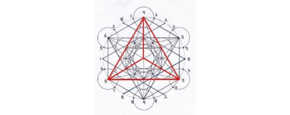 «Если бы вы знали великолепие цифр 3, 6 и 9, у вас был бы ключ к Вселенной» — писал Никола Тесла. Если же представить, что круг на рис. 1 разделен на 24 сегмента и, поместив в узел 1 цифру 0 (или 9), начнем далее по этим сегментам строить ряд Фибоначчи с «нумерологическим» сложением последовательных цифр в сегментах, соответственно, получится, что аналогам узлов с 1 по 6 на рис. 1 будут соответствовать цифры 3, 6 и 9 (9= узел 1 и 4, 6= узел 2 и 3, 3= узел 5 и 6), задающие два пересекающихся треугольника на рис. 2.