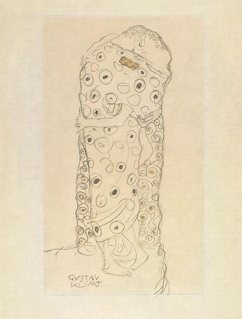 Когда я смотрю на их общие фото и на этот набросок к «Влюблённости», я думаю о том, что её холодная возвышенность над мужчиной была скорее защитной маской, реакцией на затхлый воздух светской Вены со всем её двуличием и отрицанием права женщины распоряжаться своим телом и своими чувствами. Климт разделял её взгляды и так же, как и она, ратовал за свободу женщины от гнёта устаревшей морали. Оставаясь наедине, они могли отбросить все условности, раствориться друг в друге и не думать о том, кто выше. Хотя её лицо исполнено щемящей нежности, а руки стремятся обхватить его могучую спину, хотя она буквально на наших глазах, расслабляясь, опадает в его крепких объятиях — он не доминирует над ней, он поглощён мгновением, когда два «я» сливаются в «мы». Посмотрите на этот набросок и повторите вслух расхожую фразу: «В их отношениях не было интимной близости, это особая платоническая связь». Вы в это верите? Я — нет.