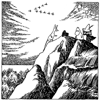 — Слушай, Муми-тролль, — отозвался Снусмумрик. — Я кое-что придумал. Давайте заберёмся на самую вершину и сложим тур из камней в знак того, что мы первые туда забрались.