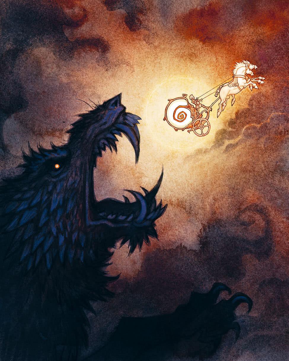 Суль и Мани мчатся быстро, потому что за ними постоянно гонятся, пытаясь их проглотить, два гигантских волка: Скёль – «вероломство», и Хати – «ненависть». Случается, что волки настигают их, и тогда можно увидеть, как солнце или луна медленно скрываются в пасти зверя, но все-таки им всегда удается спастись. Мы называем это затмениями – солнечными или лунными. Когда наступит Конец времен, волки-преследователи наконец поглотят Суль и Мани.