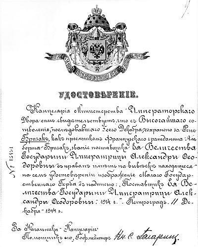 Удостоверение поставщика Двора Его Императорского Величества Рене Бризака. 1914 г.