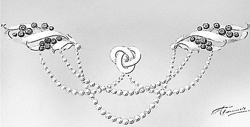 Третью позицию по деньгам в ювелирном приданом занимало жемчужное ожерелье «в 5 ниток из 237 зерен, весом 929 карат, с фермуаром из бриллиантов» работы К. Фаберже стоимостью в 171 600 руб. Таким образом, этот престижный заказ наглядно показывает, что фирма «Болин К.Э.» при всех привходящих обстоятельствах прочно входила в первую тройку придворных ювелиров.