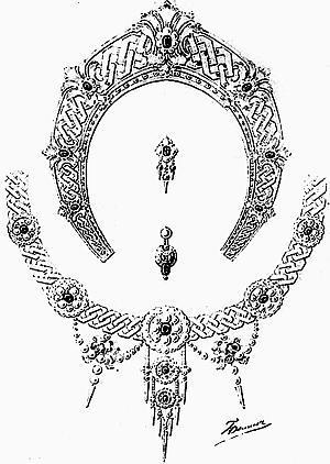 Хозяйственные подразделения Императорского двора немедленно начали формирование «положенного» «приданого Ея Императорского Величества», от панталон до драгоценностей. В апреле 1895 г. Канцелярия «Ея Императорского Величества Государыни Императрицы Александры Федоровны» запросила «список драгоценных и меховых вещей, приобретенных Кабинетом в приданое Ея Императорскому Величеству». В мае 1895 г. поступил список «драгоценных вещей, заготовленных Камеральным отделением Кабинета в приданое Ея Императорского Величества Государыне Императрице Александре Федоровне». В числе прочего в списке значилась рубиновая парюра, изготовленная мастерами фирмы «Болин К.Э.». Парюра обошлась Кабинету в безумные деньги и состояла из ожерелья (88 375 руб.), броши (45 200 руб.), пары серег (20 720 руб.) и диадемы (36 000 руб.). Как легко сосчитать, вся парюра обошлась Кабинету в 190 295 руб.[67]