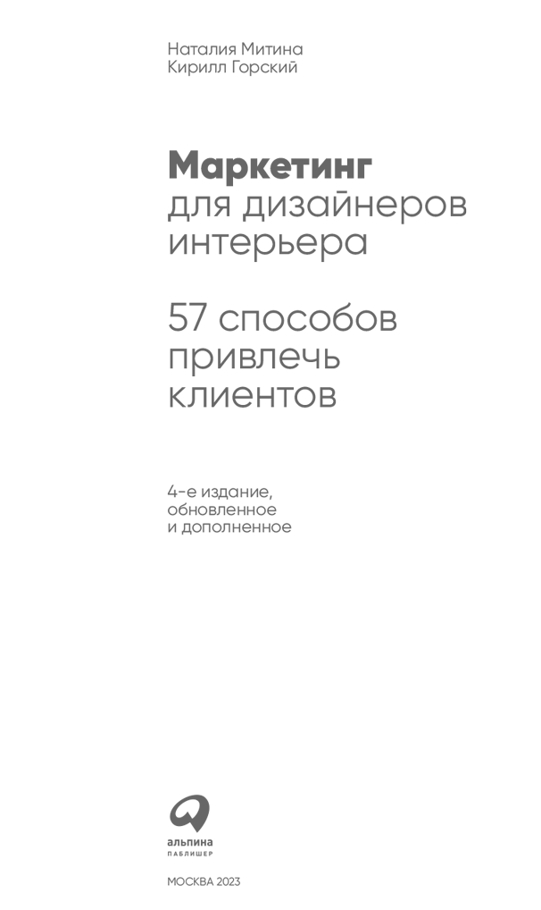 Привлечение клиентов — то, чему не учат в российских школах интерьерного дизайна, но это не значит, что исследованием этой темы никто не занимается. Мы, авторы книги, Кирилл Горский и Наталия Митина, уже больше десяти лет исследуем продажу дизайнерских услуг и маркетинг в дизайне. Каждый со своей стороны. И мы хорошо знаем: в поиске и привлечении клиентов в области дизайна интерьеров нет никакой мистики, нет случая или удачи. Есть то, чем большинство дизайнеров пренебрегает, — процесс, постоянство деятельности. Действенное, эффективное привлечение клиентов — долгосрочный труд. Это работа, которую нужно делать ежедневно, на протяжении многих месяцев, даже в то время, когда вы полностью загружены проектами и у вас нет недостатка в клиентах.