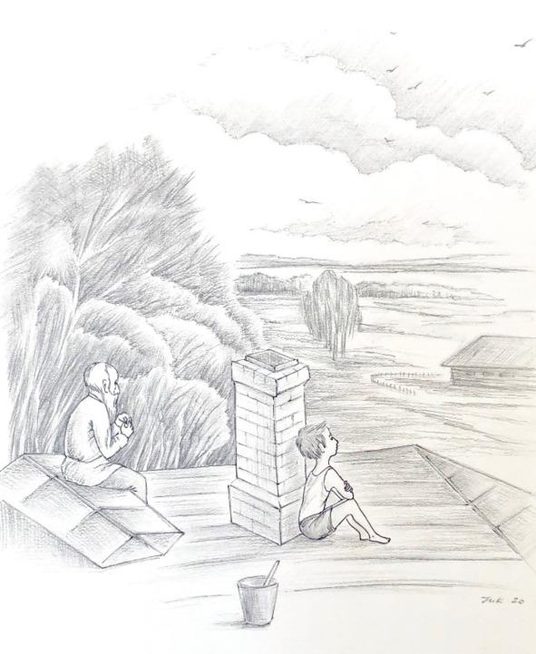 — А ну как тятенька заметит, что к трубе-то вылез, да задаст нам обоим, а?